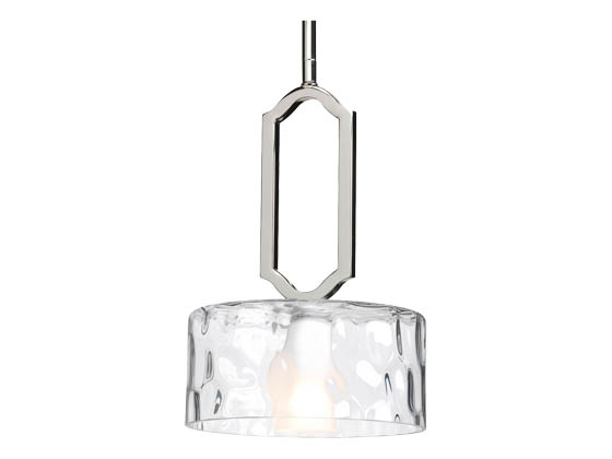 Progress Lighting one-light mini-pendant. Caress features a chic, sophisticated three-light chandelier featuring a Polished Nickel metal frame with layered glass diffusers to cast a glimmering light. An outer shade of clear, water glass adds rich texture and playful reflections from a central etched glass diffuser.