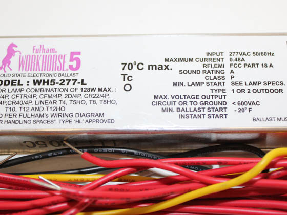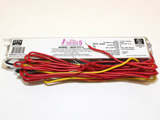 Fulham Brand WorkHorse 5 Electronic Ballast, 277 Volt, with Leads. Ten ballasts operate 132 lamps in 860 combinations.  Ballast Lamp Starting Mode:  Instant Start.